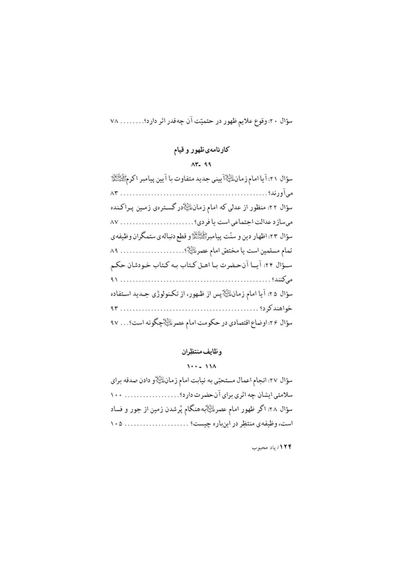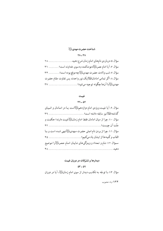 نويسنده فاضل كتاب ـ كه سال هاست با ارادت تمام به خدمتگزارى امام عصر عليه السلام همّت گماشته ـ در هر كدام از 3 دفتر اين اثر به پاسخگويى 30 پرسش درباره آن حضرت پرداخته كه از جنبه همگانى ترى برخوردار است و بدين سان، در مجموع به 90 پرسش در موضوع مهدويّت پاسخ هاى مستدلّى داده است. وى در انجام اين كار از آيات و روايات بسيار استفاده كرده و در ضمن، مخاطبان را براى تحقيق بيشتر به منابعى پُرشمار و معتبر ارجاع داده است. «امامت و مهدويّت، بشارات كتب آسمانى، شناخت حضرت مهدى عليه السلام، غيبت، ديدارها و تشرّفات دوران غيبت، برخى از آثار وجودى امام زمان عليه السلام، طول عمر، شرايط ظهور، كارنامه ظهور و قيام و وظايف منتظران» موضوعاتى است كه در صدر پرسش هاى مطرح در كتاب حاضر قرار گرفته است. آگاهى شايان توجّه نويسنده درباره جنبه هاى گوناگون موضوعات يادشده و اختصارى كه آن را در پاسخگويى به سؤالات مراعات كرده، به راستى در خور ستايش و اعتناست. نثر ساده و خالى از تكلّف اثر نيز به قابل استفاده بودن آن براى همگان، و به ويژه نوجوانان وجوانان، يارى فراوان رسانده است.